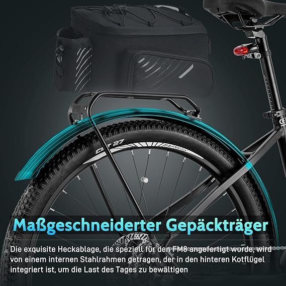 - Estante trasero personalizado: la exquisita estantería trasera a medida para bicicleta Fafrees FM8 E para hombre está respaldada por un marco de acero interior integrado en el guardabarros incorporado. Dondequiera que vaya, conducirá cómodamente y llevará todo lo que necesita mientras está protegido de forma segura del polvo y la suciedad.