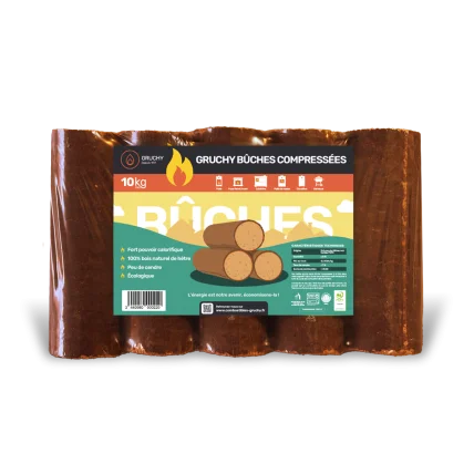 Los troncos de madera densificada Gruchy son conocidos por su rápida combustión, su superior eficiencia energética y su larga duración. Están hechos de serrín de haya.